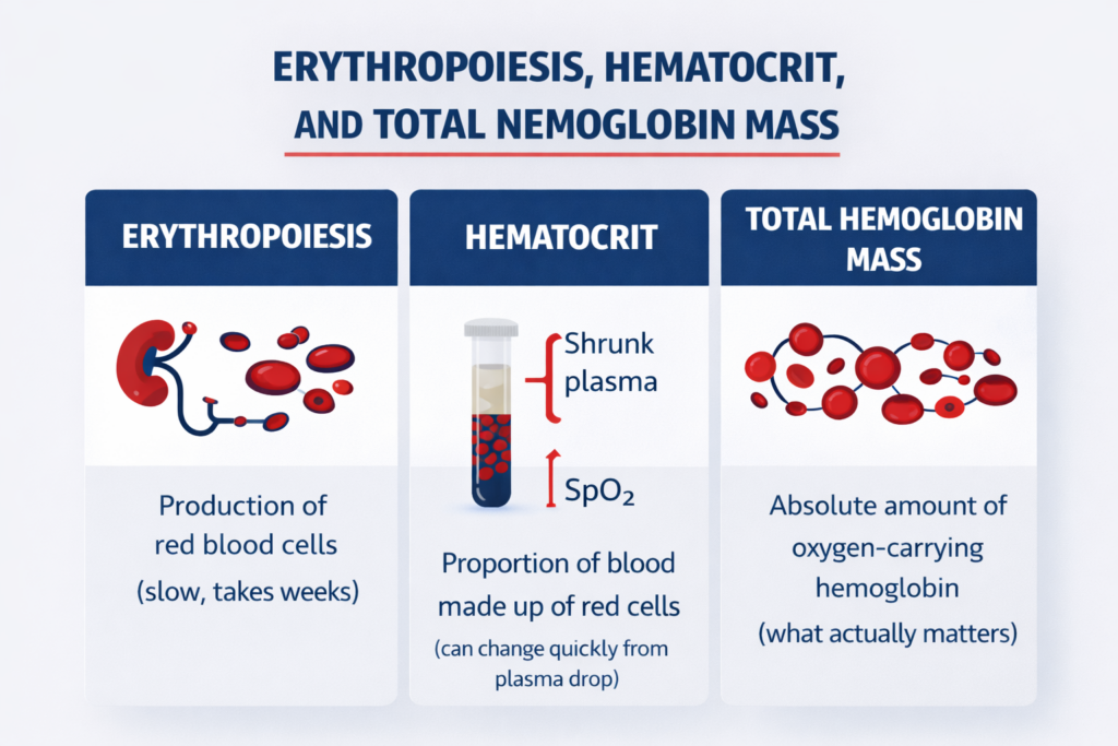 The main physiological target is the stimulation of erythropoiesis — the process of manufacturing new red blood cells. The idea is to create a hypoxic stimulus strong enough to signal the kidneys and bone marrow to raise total hemoglobin mass over weeks.