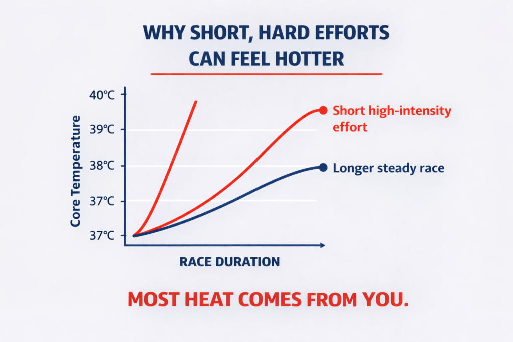 Heat stress is driven primarily by internal metabolic heat from the muscles. Shorter, very high-intensity efforts can raise core temperature faster than longer lower-intensity events. Middle-range distances (for example the 5k–10k range at elite intensity) are particularly vulnerable because they combine high intensity with a long enough duration for heat to accumulate.