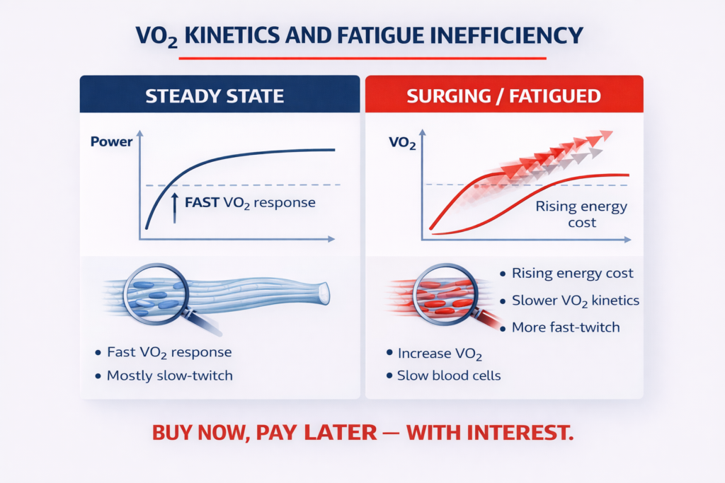 As intensity increases and the body recruits larger motor units and fast-twitch fibers, the time constant for VO2 response slows. The aerobic system lags more, and anaerobic processes fill the gap. Repeated or sustained use of these fast fibers creates metabolic fatigue that increases inefficiency at the muscle level. The net effect is that more energy is required to produce the same power output and the body’s ability to stabilize VO2 at high intensities fails — VO2 continues to drift up, and time to exhaustion shortens.