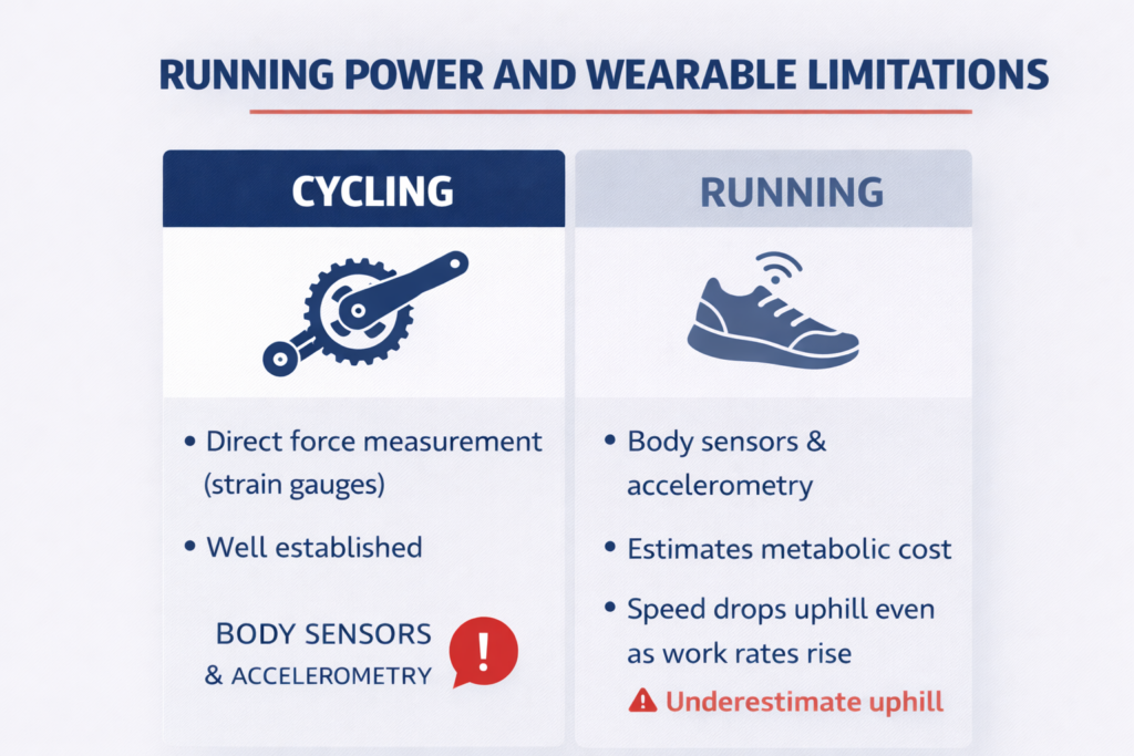 Running power devices are improving, but they have not reached the maturity and accuracy of cycling power meters yet. Running presents particular challenges: accelerometry-based devices can underestimate metabolic cost when running uphill because speed drops while work against gravity increases.