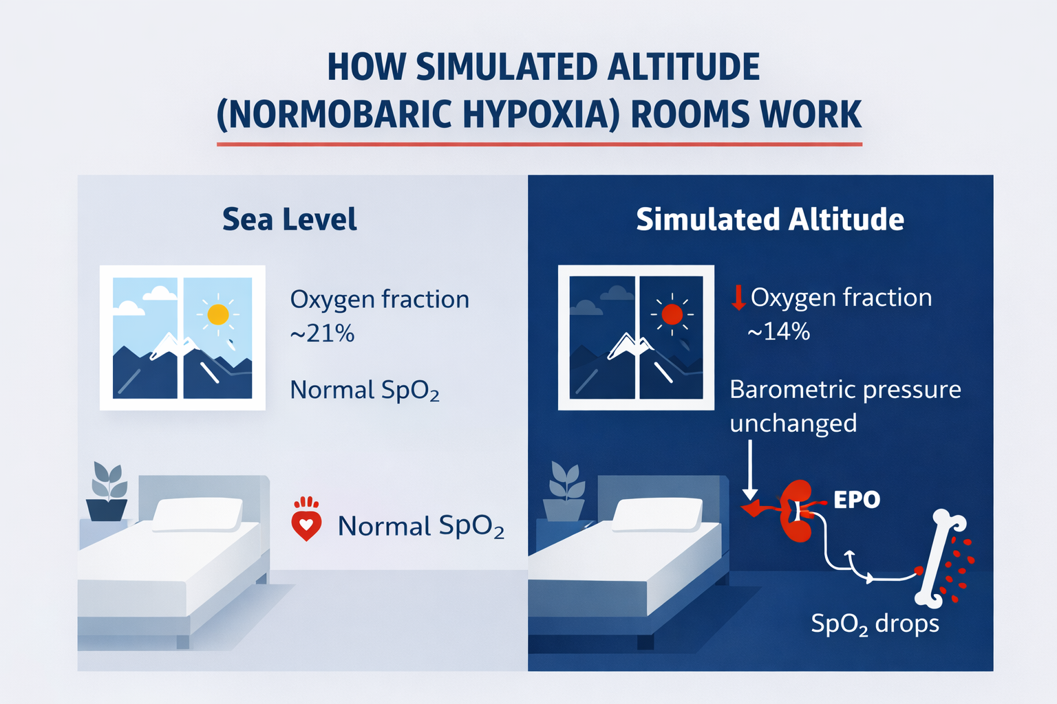 - Simulation differs from true altitude. At real altitude barometric pressure and oxygen partial pressure both fall, whereas in normobaric rooms only oxygen fraction changes.