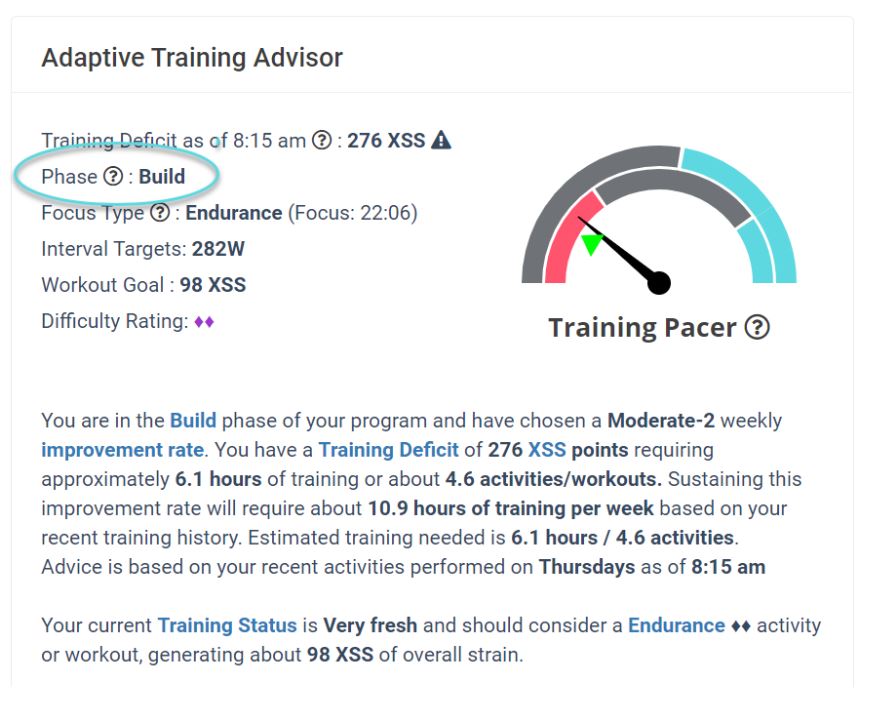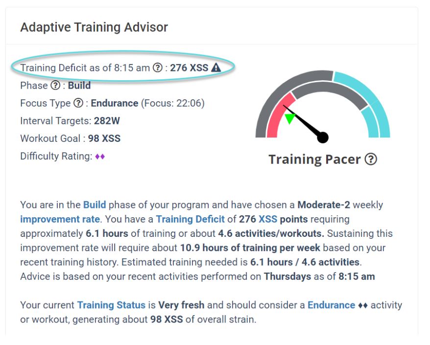 “It’s Thursday. You usually start your rides around 8:15 am. Given all the work you’ve done this week, and your goals, you are 276 XSS points behind the weekly volume goal.”