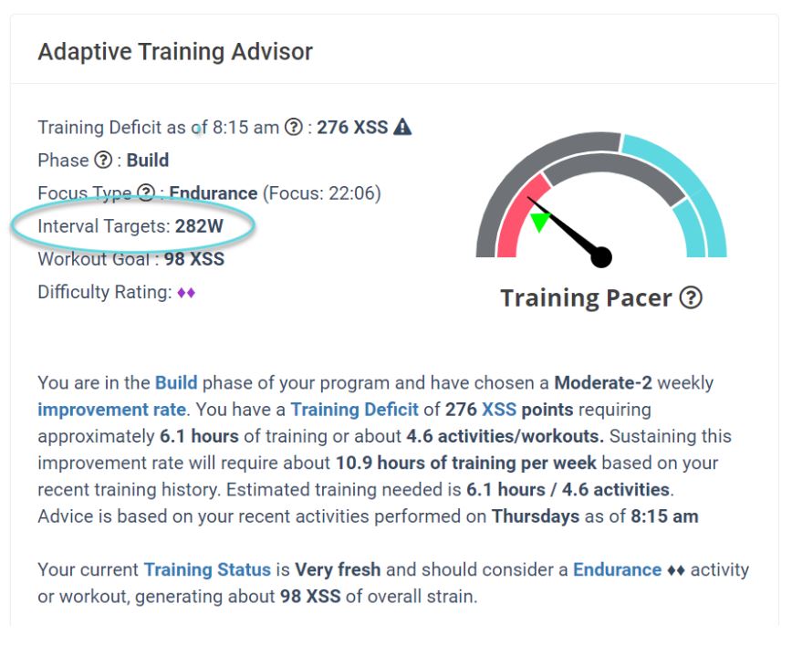 I’m still 276 points in the hole, I still need an endurance ride, and the recommendation is now 107 XSS with a slight change in Interval Targets at 284w.