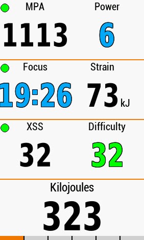 Next is STRAIN. STRAIN is one of my favorite measurements in Xert, but it’s not given the kind of attention that it deserves. I’ll post about it more in a separate blog entry, but the TL:DR version of XERT STRAIN means this: It only goes UP as you ride, and when combined with FOCUS, it can help you govern your rides. After 30 minutes, my XERT STRAIN was 73 kilojoules. Watch what happens after Lap 2…. - XSS is the measurement I was aiming to match today. After one lap of my course, I was at 32 points of Xert Strain Score, and I need another 50 points to reach my daily goal.