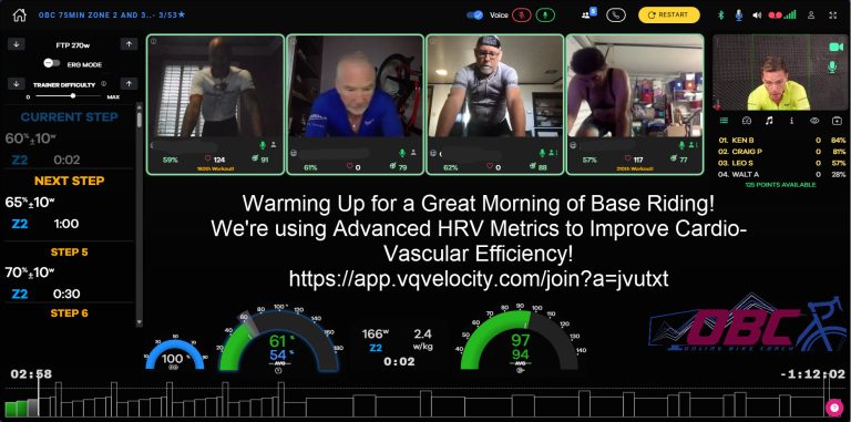 Online Bike Coach’s VQ Velocity Virtual Studio offers live, replay, and on-demand workouts led by Coach Wharton, featuring personalized video instruction in a group setting. With over 300 workouts (and counting)—Coach Wharton’s VQ Velocity workouts cover